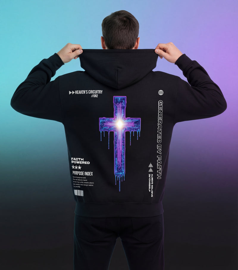 Purpose-led pieces blending faith symbolism with a futuristic tech aesthetic.